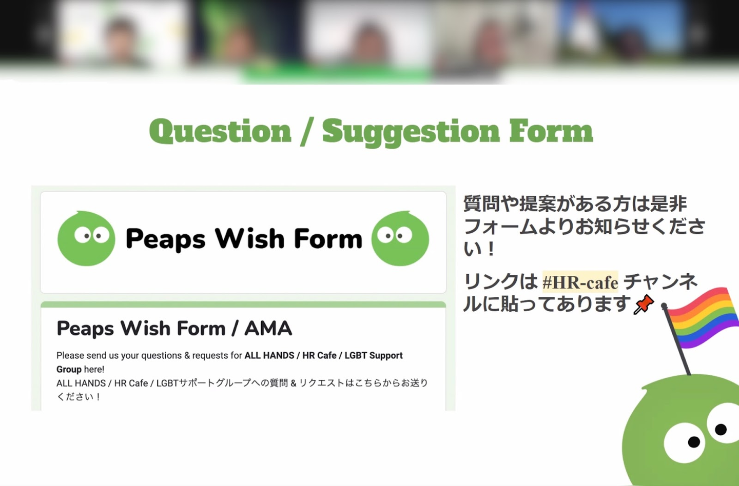 また、PeatixにはLGBTQ+当事者のPeapsが発足した「LGBTサポートグループ」があります。Peatix社内へのサポートに加えて、イベント・コミュニティプラットフォームとして社外のLGBTQ+コミュニティへの支援を行うことを前提に、Peaps同士がコミュニケーションを取れるグループです。例えば、LGBTQ+に関するイベント主催者と仕事をしたPeapsがわからない単語を聞いたり、PeatixとしてLGBTQ+支援活動をするために協力できるイベントや団体の提案ができます。