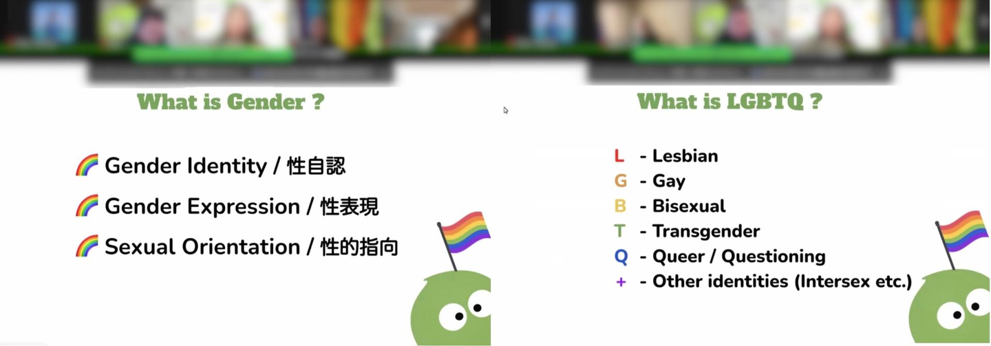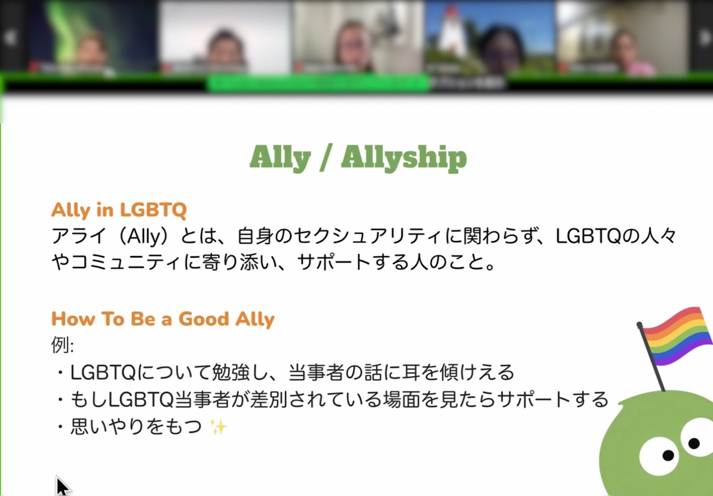 セッションのはじめには、セクシュアリティに関する言葉やプライド月間の始まりとなった出来事についての説明がありました。言葉の意味や歴史を知らないがゆえに、無意識のうちに周りの大切な人を傷つけてしまっていたら悲しいですよね。改めて正しい知識を学ぶことは、そういった悲しい事態を減らすことにもつながります。