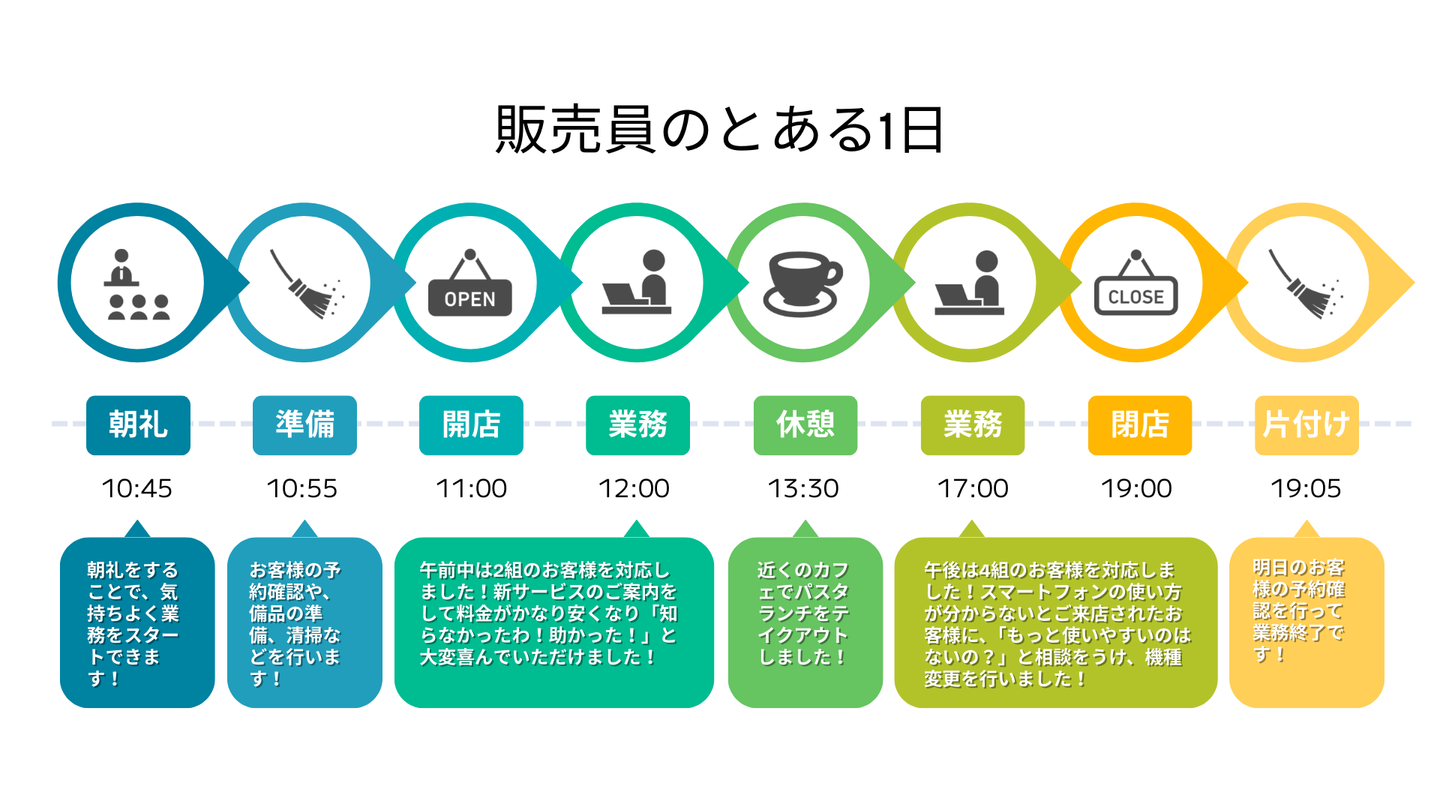 毎日が新しい発見と学びの連続!当社のモバイル販売員は、どんなスケジュールで仕事をしているのか、実際の声と共にご紹介します。