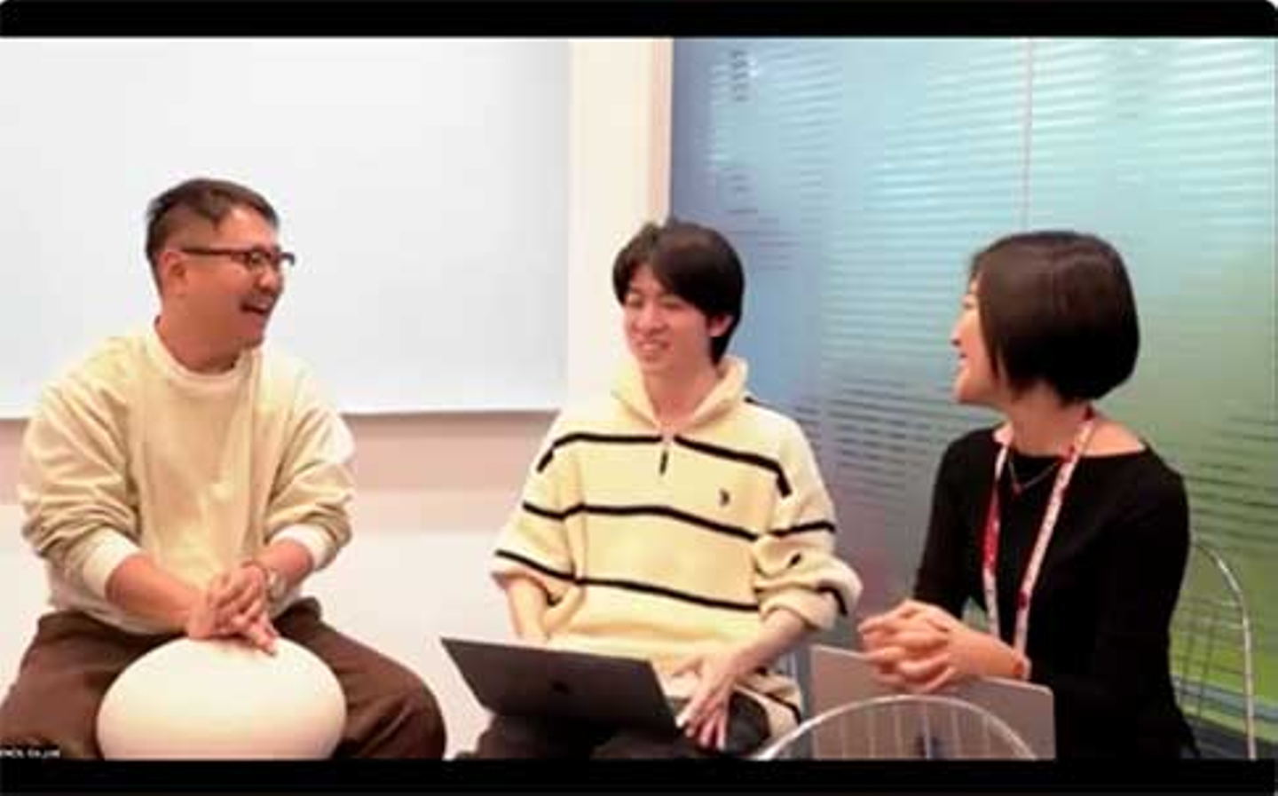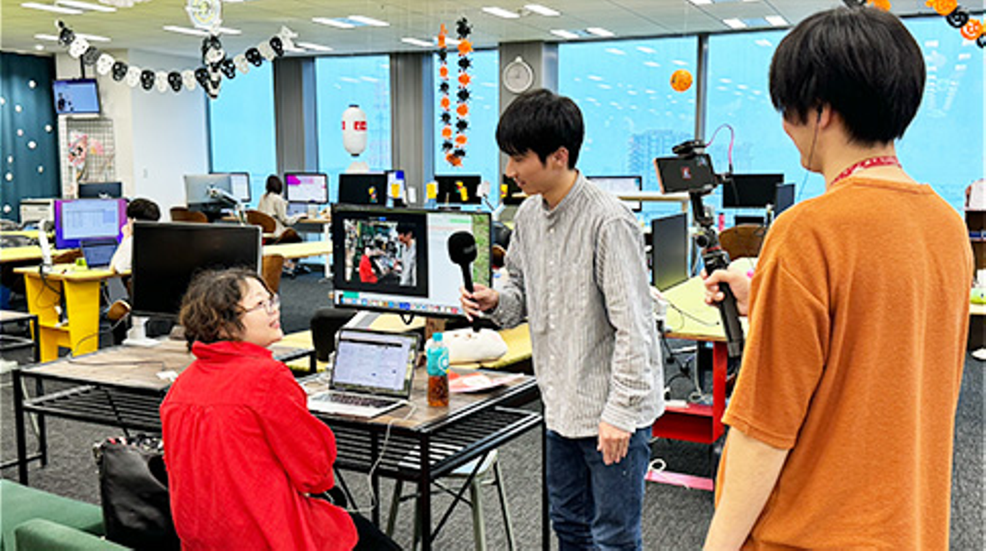 さらに、ウェビナー終盤にはそれまで登壇していた司会の二人がカメラとマイクを持って、オンラインの世界からリアルなオフィス内に飛び出して視聴者に突撃インタビュー 。