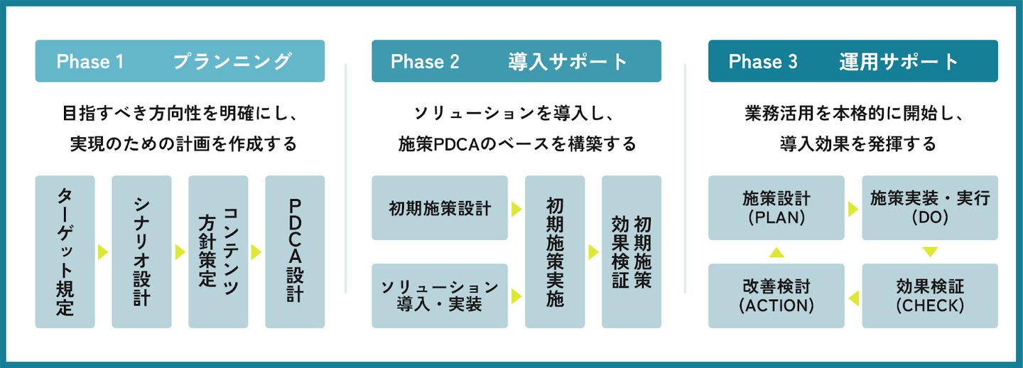 そこでうちが対応したのが、MAツールと営業支援ツールのシステム連動。ザックリ言えば、ツール画面を見ていれば「この人に営業アプローチすればいいね」というのが分かる状態にしたというイメージです。このようにシステム開発・改変を含め、技術的サポートに入るケースもあります。