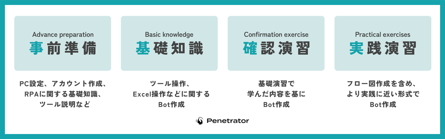 ただし、ペネトレイターは事業部毎に教育プログラムがそれぞれ異なるため、今回は『RPA事業部の研修内容』にフォーカスしました。