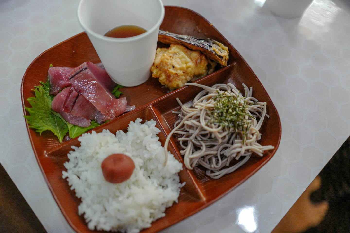 『ご飯with梅干し、そば、鶏肉とナスの天ぷら、カツオのお刺身』