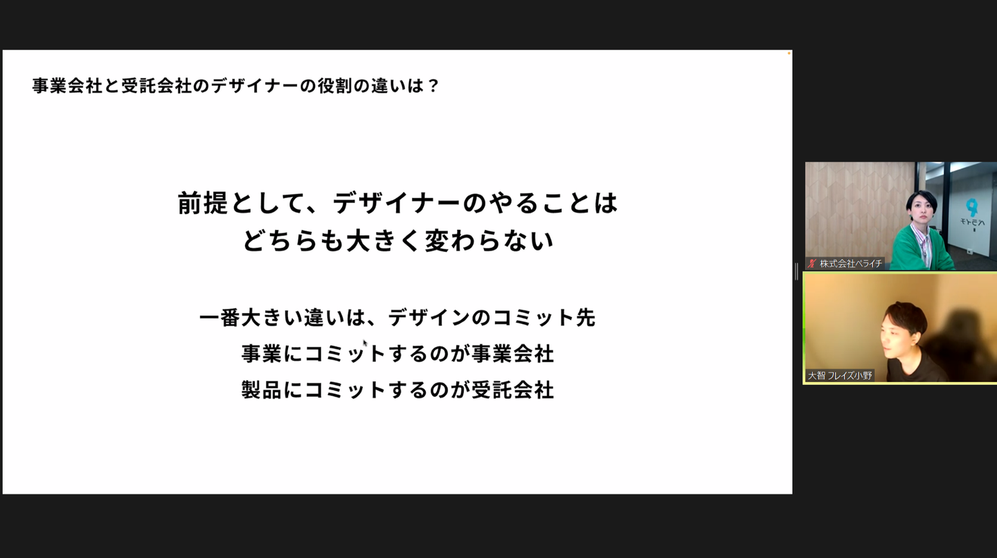 フレイズ社で取締役をされている小野さん。事業会社も受諾会社も複数ご経験されてきたからこそ感じる、それぞれのメリット・デメリットについて解説いただきました。また受託会社から事業会社へ行くってどうなの?についても。Webデザイナーさんなら誰しもが通るであろうお悩みポイントについてお話しいただきました。