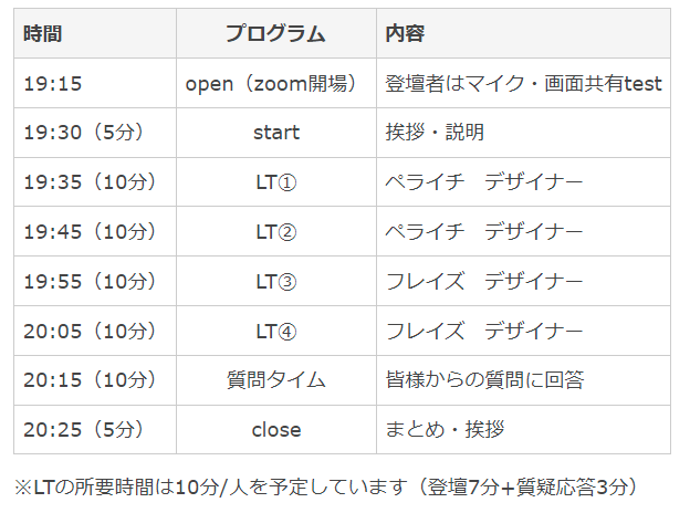 4/25(火)夜に、WebデザイナーLT勉強会#1~キャリアトーク~というイベントを開催しました。4人のWebデザイナーさんをお迎えしてご自身のキャリアを話していただくオンラインイベント。平日夜にも関わらず、30名近い方にご参加いただきました。ご参加いただいた皆様、お忙しい中でありがとうございました♪