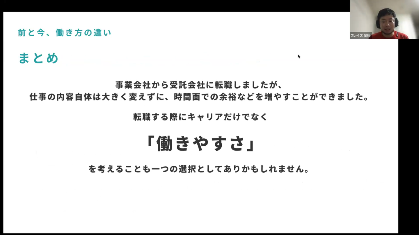 岡松さんの最後のまとめでは、転職する上で様々な考え方があること、そしてキャリアやスキル、給与の他にも「働きやすさ」という視点もあるかもしれないというメッセージで締められました。どんなデザイナーになりたいのか、どんな働き方をしたいのか、何を得たいのか?を一度考えてみることも、今後のキャリアを作るヒントになりそうですね!