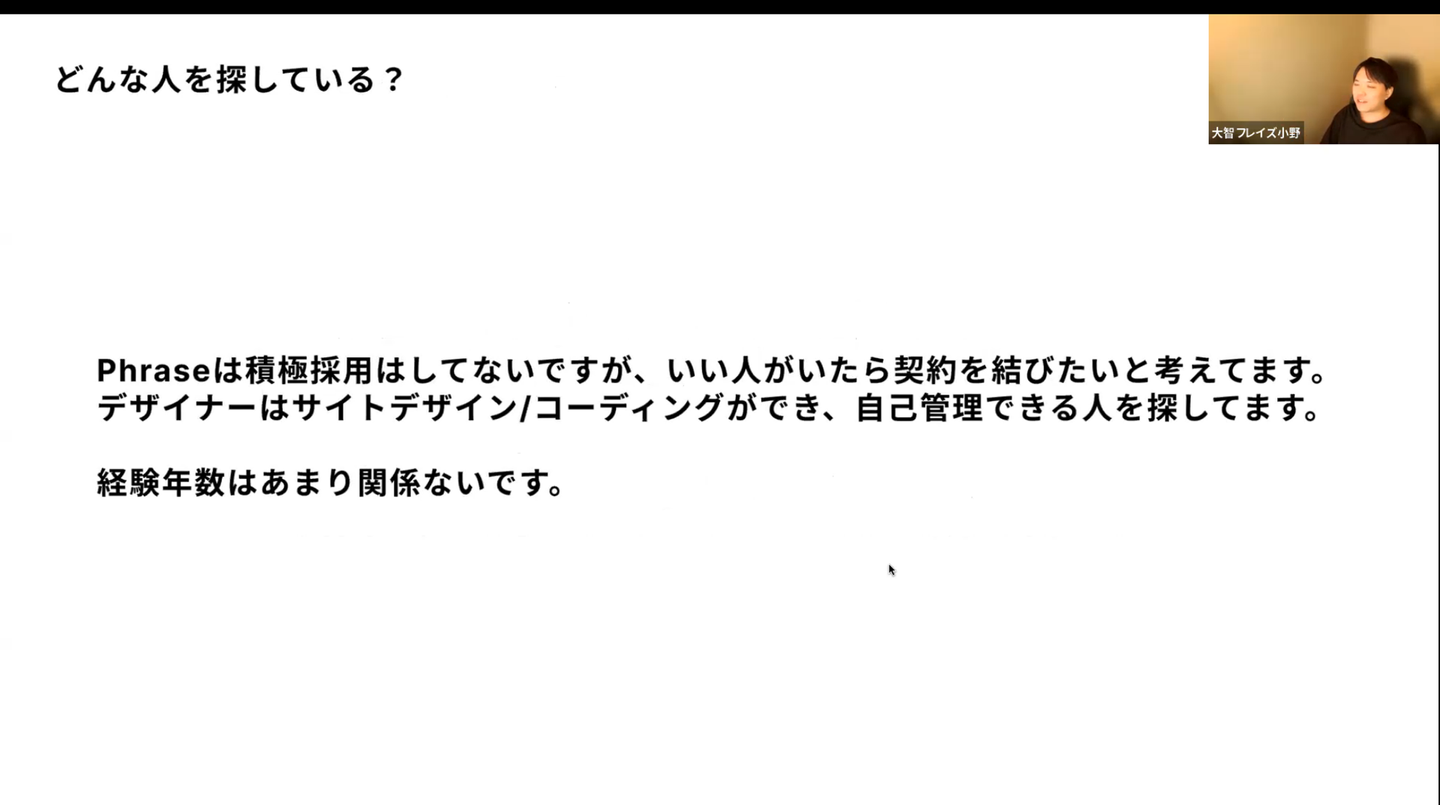 岡松さんには前職の正社員としての働き方とフレイズ社での働き方の違いについてお話しいただきました。フリーランスならではの働きやすさ(出社がない・自分で稼働時間をアレンジできるなど)が上がり、一方で事務手続き(請求書発行や確定申告など)の手間が増えたとのこと。業務に関してはいい意味で大きな変化はなく、フレイズ社にJoin前は「食いっぱぐれたらどうしよう...」というご不安もあったそうですが、フレイズ社の体制や進め方が合っているそうでスムーズにJoinでき、満足しているとのことでした。