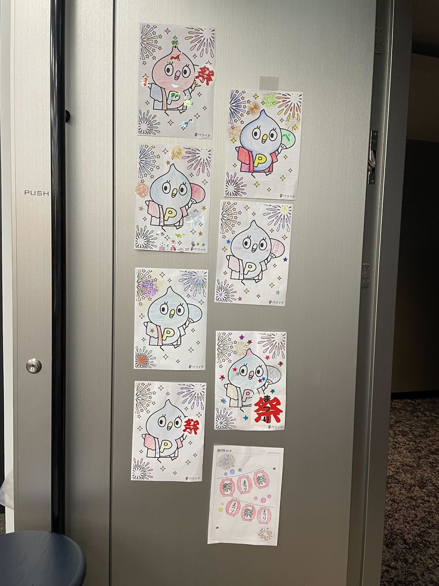 ▲みんなが塗ってくれたぬりえをペライチオフィスの入り口に!個性豊かなピーちゃんたち、かわいい〜♪