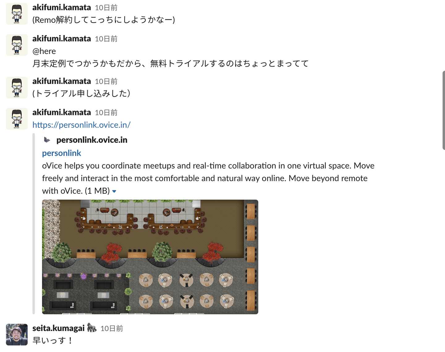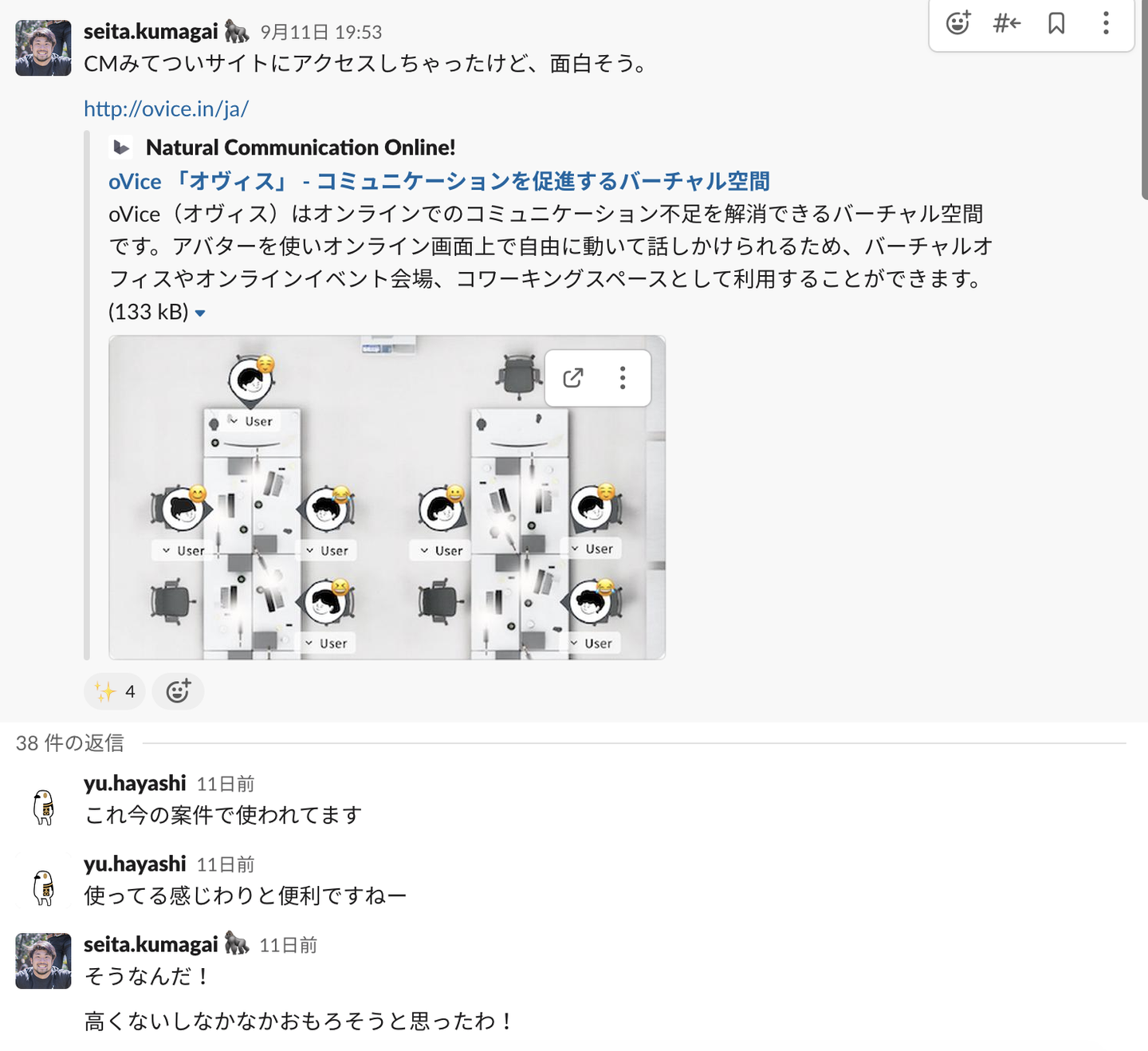 oViceとは、簡単にいうとバーチャルオフィスのことです。まるでオフィスにいるような感覚でメンバーの気配を感じたり、立ち聞きをしたりふらっと会話に参加してみたりすることができます👍