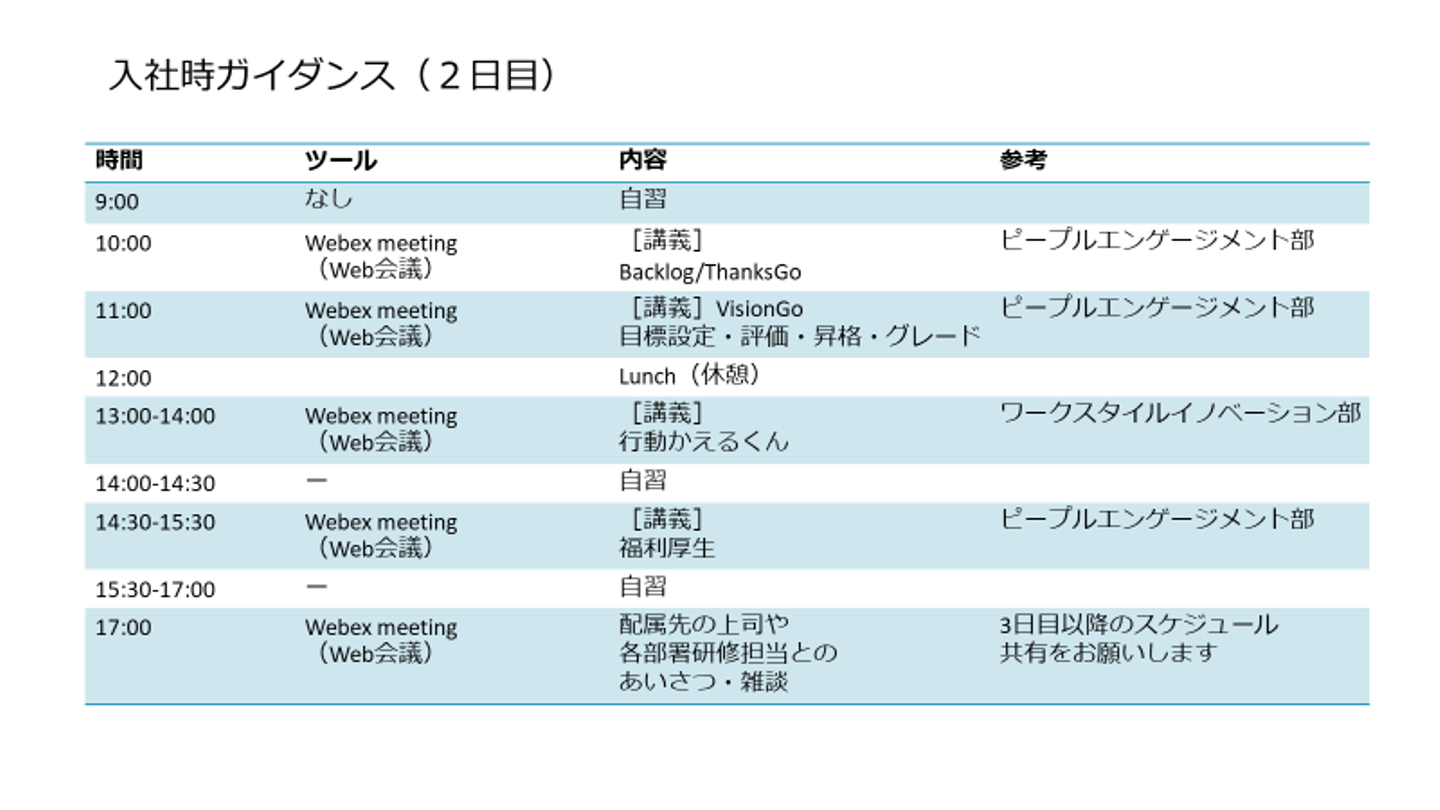現在、入社時のガイダンスは2日間実施しています。