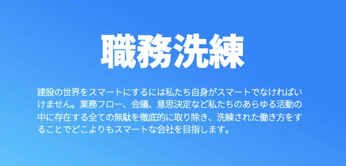 職務洗練とは、建設の世界を限りなくスマートにする私達が、一番スマートな働き方をしていようという思いで作られたValueです。制度設計の際にはリモートワークなどの洗練された働き方を推進する制度を積極採用したり、社内で日々の業務を効率化するような活動を称賛するものです。