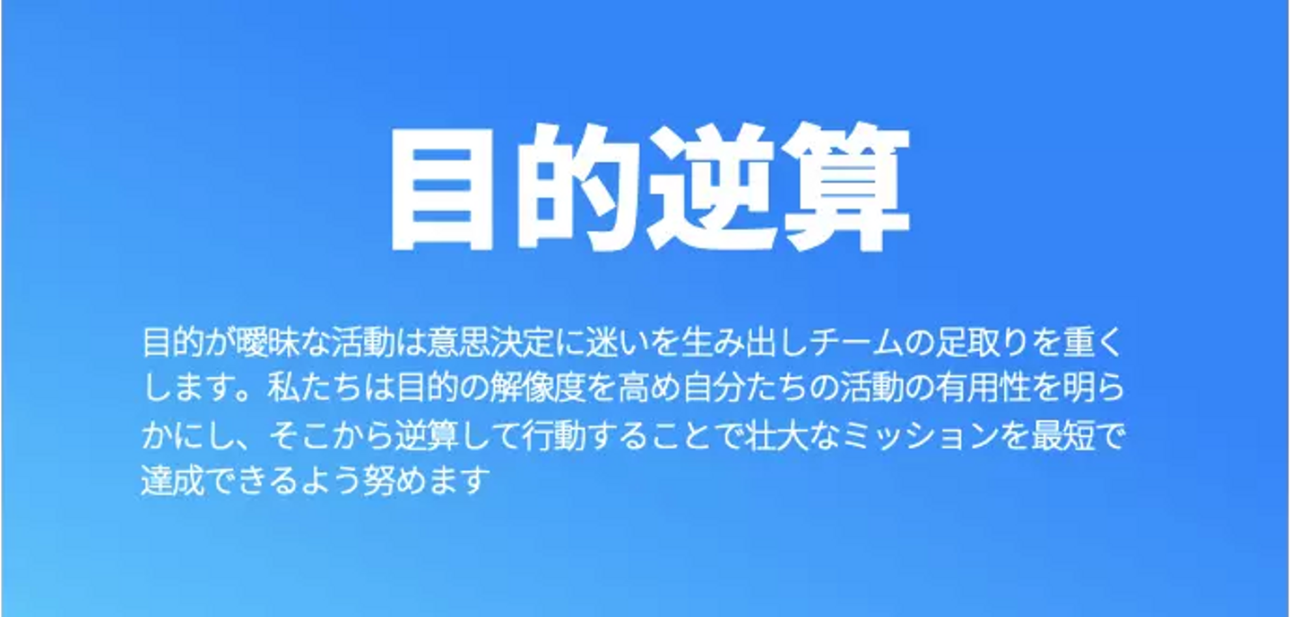 目的逆算とは、曖昧な意思決定をしない、判断に迷ったら目的に立ち返ることを重視するというValueです。その機能開発の目的はなにか、会議の目的はなにか。日々の業務の中で当たり前に目的を意識することで、正しい方向に前進していくことを目指すValueです。