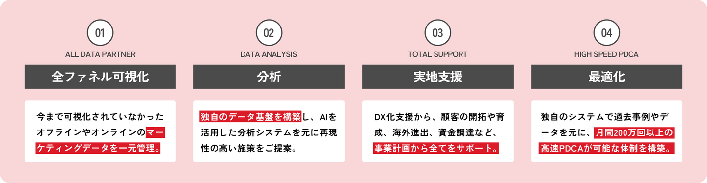 そこで収集したデータからマーケティング戦略の立案やLTV向上のための施策を実行までサポート。また資金調達支援、海外進出支援など多角的な視点でクライアントをサポートすることで、課題を根本から解決しています。