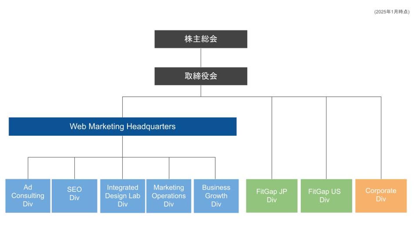 これらに対応して、社内の事業部は大きく、Webマーケティングを担う部署「Web Marketing Headquarters」、FitGapを運営する部署、経営管理部の3つに分かれています。