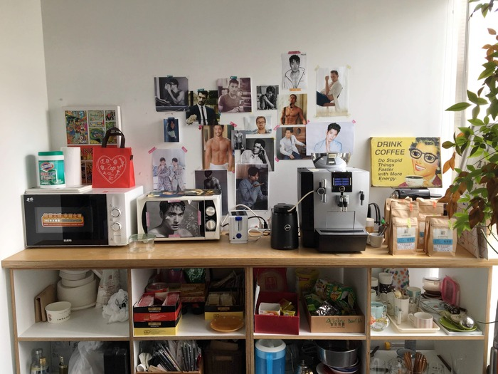 オフィスの一角にあるコーヒーコーナー。世界中のイケメンの写真が貼られています(笑)中にはあの日本のイケメン俳優の写真も!女性スタッフの多いPinkoiならではです。