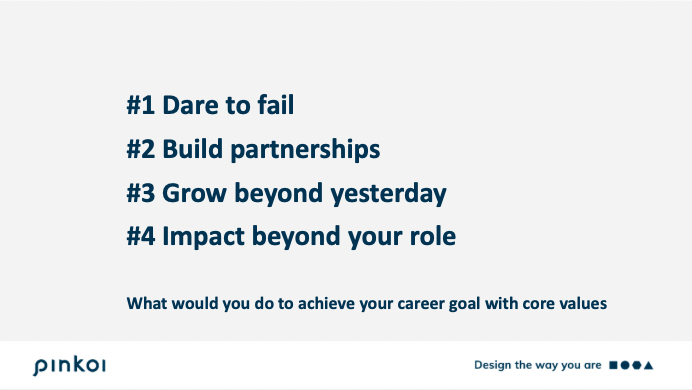 Pinkoiが Core Values を大事にしている理由は、会社からの明確な期待や信念を伝えることで、強いチーム・組織として日々成長できる環境を一人一人に創っていただき、会社の一員として会社と共に成長して欲しいという想いがあります。