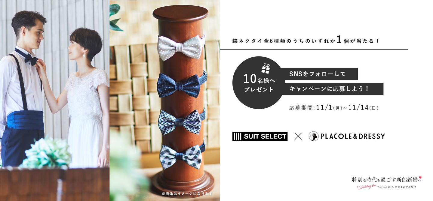 「特別な時代を過ごす新郎新婦へ」SUIT SELECT と PLACOLE & DRESSYのコラボ企画!10名様に『蝶ネクタイ』をプレゼント!