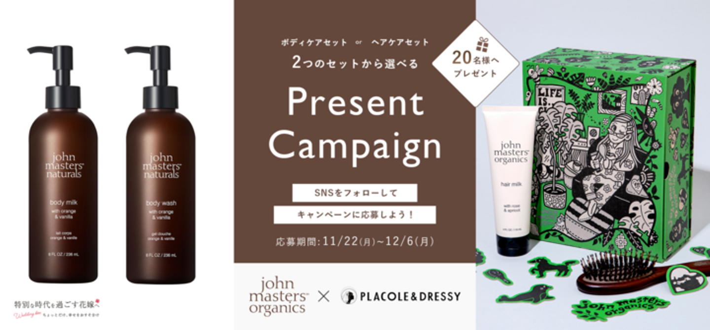 「特別な時代を過ごす花嫁へ」 john masters organics と PLACOLE & DRESSYのコラボ企画!20名様に『ヘアケアセット』or『ボディケアセット』をプレゼント!