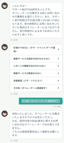 KARTEちゃんはボットですが、私たちサポートメンバーが問題を解決するために必要な事前情報を確認してもらっています。まだまだボットであるため回答いただけなかったり、KARTEちゃんもノウハウがなく見当違いな回答をすることはあります。