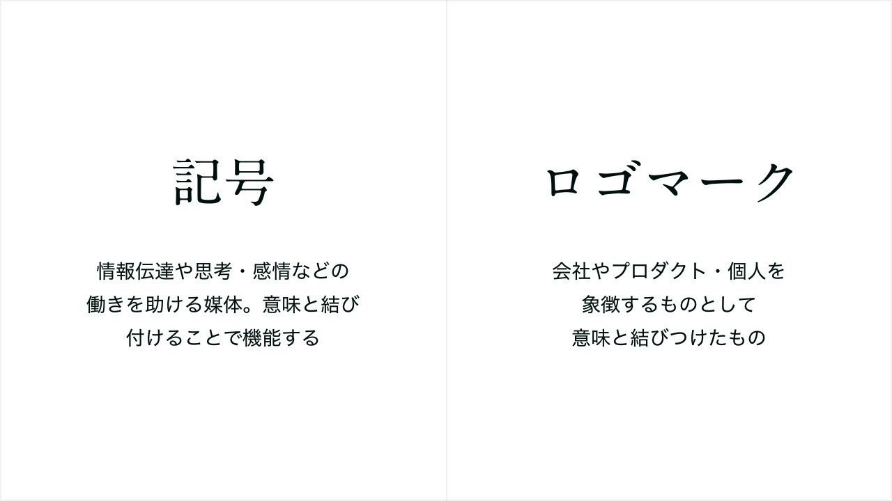 何らかの情報を伝えやすくしたり、思考活動をしやすくするための図形が「記号」であり、それを会社やプロダクト・個人を象徴するものとして、意味と結びつけたものが「ロゴマーク」と言うことができそうです。