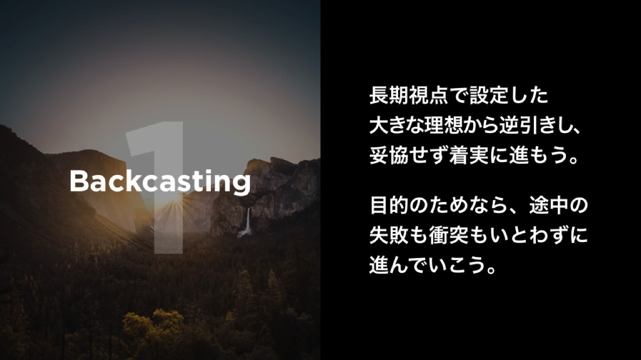 長期視点で設定した大きな目的から逆引きし、妥協せず着実に進んでいく。目的のためなら、途中の失敗や衝突もいとわず進んでいく姿勢を重視しているというものです。