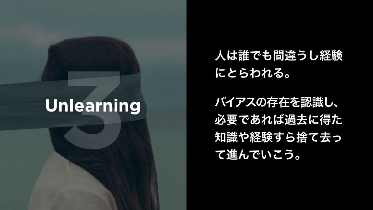 人はだれでも間違うし、過去の経験にとらわれること、バイアスが存在することを認識した上で、必要であれば過去に得た知識や経験すら捨て去って進んでいこうという姿勢です。