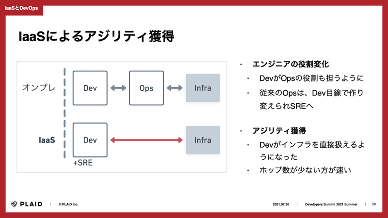 IaaSは、インフラを気にせずに新しい機能を追加したいDevと、システムを安定稼働させたいOpsの対立を解消しました。IaaSの登場以降、Devだけでインフラ構築が完結可能になり、開発業務のアジリティが向上しています。