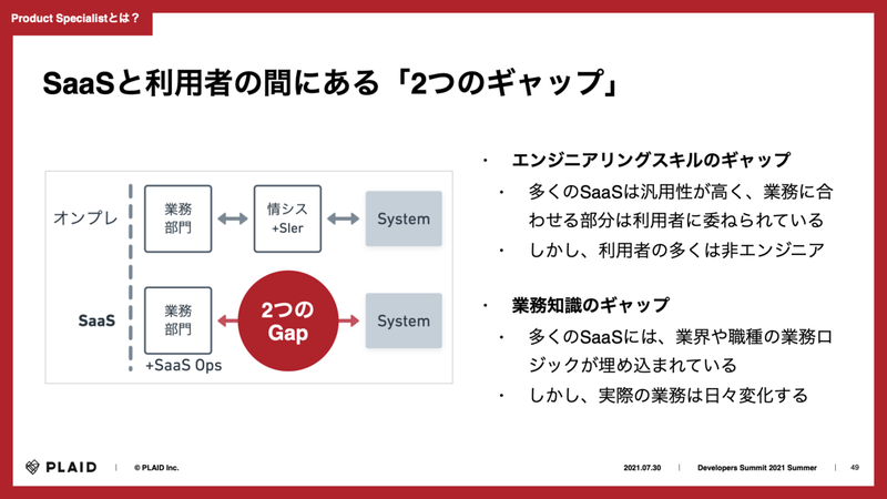 ただ、「ノーコードで誰でも簡単に使える」といっても、誰でも価値あるシステムがつくれるかというとそうではないと考えています。私もKARTEの提供を通じて実感したのですが、SaaSとユーザーの間には以下の2つのギャップがあると考えています。
