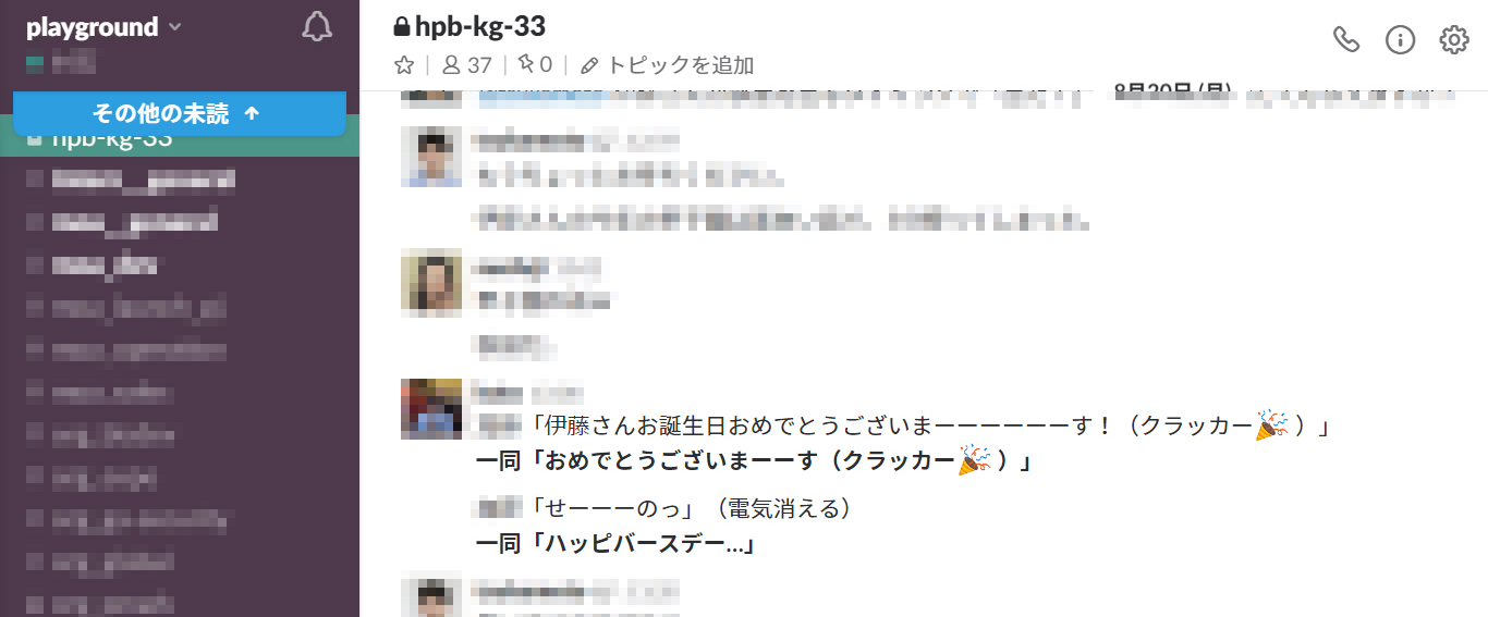 ↑ちなみに今回の企画は伊藤にばれないように秘密裏にSlackでチャンネルを作り、各自のダンスや漫才の練習の進捗状況、当日の進行等を話し合っていました。これは誕生日当日の伊藤が執務室に入室する前に、周知している場面です。