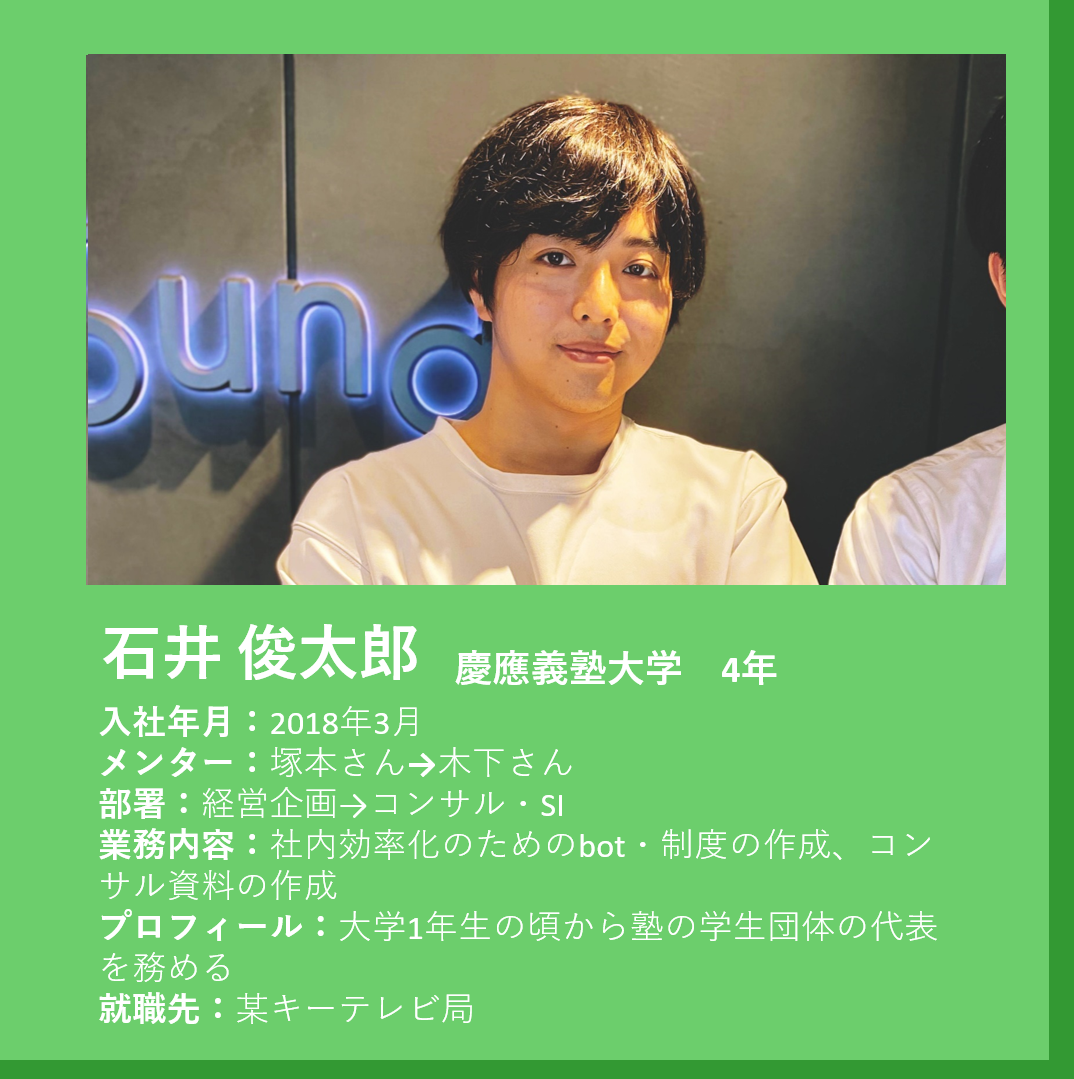 石井 僕は、毎月行っていたインターン面談の中で、よくメンターの塚本さんにキャリアの助言をもらっていました。最終的に大手(某キー局)に決めた理由は、塚本さんの影響も大きかったです。はじめは、スタートアップも面白そうだと思っていたのですが、面談の中で塚本さんに、「大手の完成された状態を見て、そこで学んでからスタートアップ行くこともできる。大手企業は日本社会を回していて『THE 日本社会の縮図』みたいなところを学べる機会があり、研修制度も整っているから、視野を広げるという意味でも最初はぜひ大きい会社に入ることをお勧めする」と言われて。それが自分の価値観にも合ったので、大手を見るようになりました。某キー局では、新規事業部で活動できる可能性も高いと聞き、就職先に決めました。僕は先ほど話した学生団体での経験が自分のベースにあり、「自分が手掛けたもので世の中に貢献できたら嬉しいな」という思いを持っています。就職先のテレビ局は、大きなメディアを持っていているので、影響力が大きいところで働けるのは、面白そうだと思いましたね。
