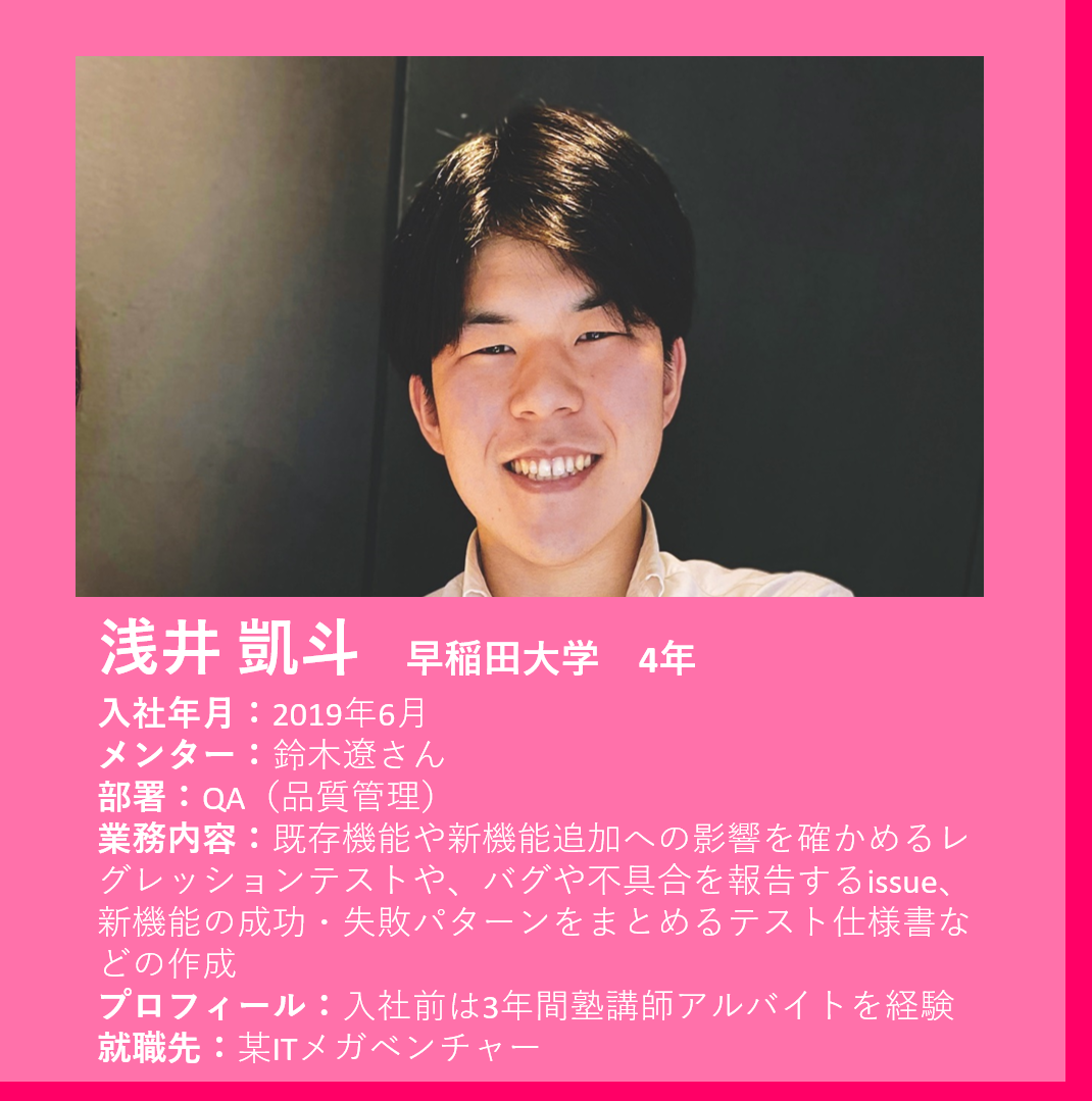 浅井 僕は、大学4年生の6月にQAインターンとして入社しました。なので、某ITメガベンチャーから内定をいただいた後、入社したことになります。それ以前は、大学1~3年生まで予備校で働いていて、そこでリーダーや保護者対応など経験させてもらったのですが、井の中の蛙というか、そこで満足している自分がいました。将来、ビジネスとITスキルを掛け合わせた人になりたいと思った時に、もっとスキルを磨きたいと思いました。playgroundのQA業務は自分の求めていたものと合っていたので、入社を決めました。