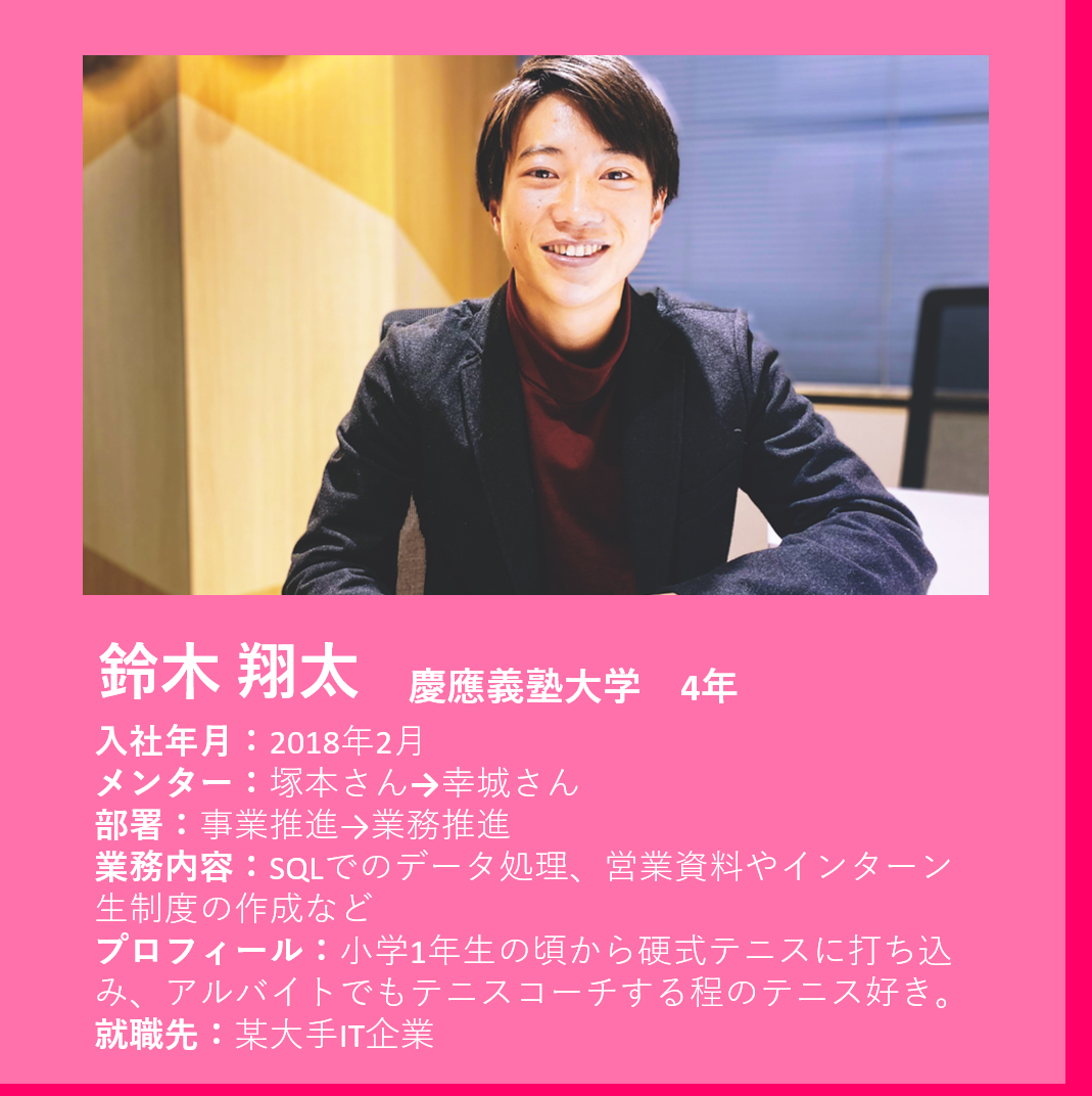 鈴木 僕は大学2年生の2月に入社しました。大学に入る時点で長期インターンの存在は知っていて、いつかやってみたいと思いつつ、入学から2年の途中まではサークルで遊んでばかりの生活でした。2年生の時に、「そろそろ何か本気でやらないと、就活やばいな」と漠然と不安に思ったのが、インターンを探し始めた本音です。