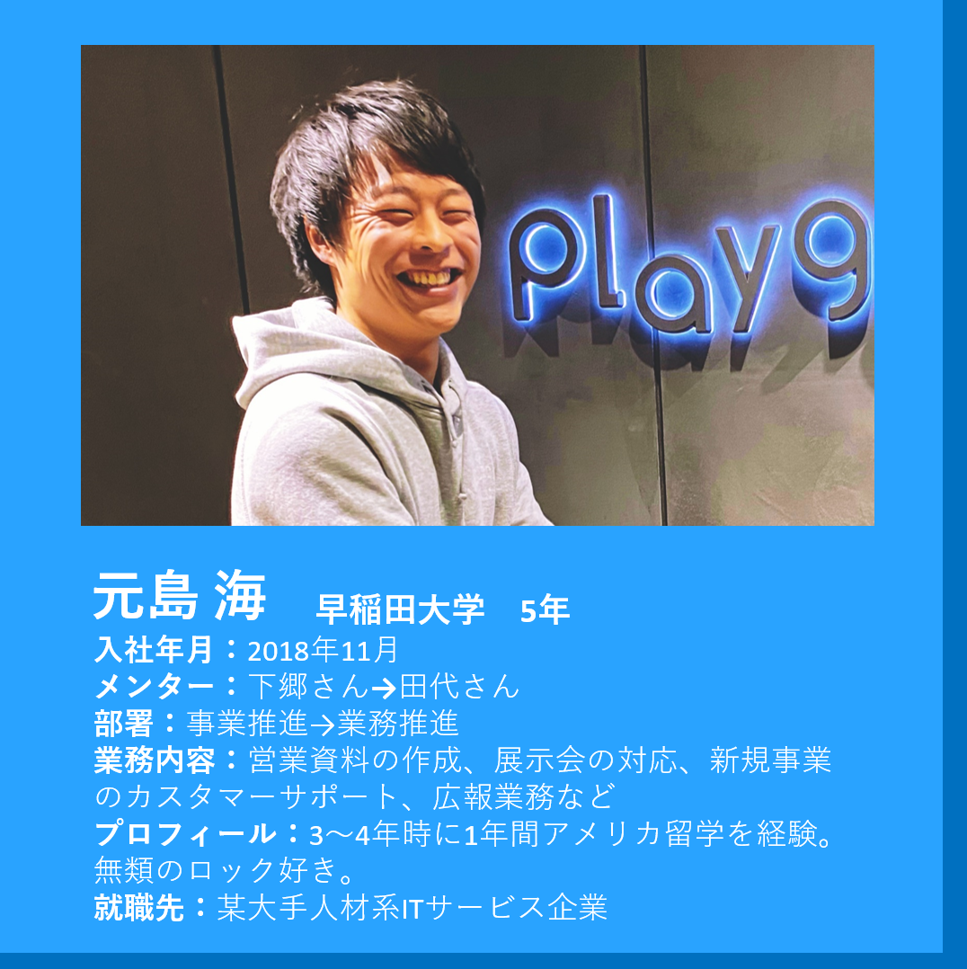 元島 僕は、playgroundに来る前から、エンタメ業界にいきたいとは漠然と思っていました。playgroundの活動を通して、興行への導入・運用の流れを知り、エンタメ業界のリアルを知る事ができています。それでもなお「いつかはエンタメ業界で働きたい」「エンタメ業界に寄与したい」と考えるようになりました。僕の元メンターが某人材ITサービス企業出身なのですが、playgroundで活躍されている姿を見て、1社目はエンタメ業界にこだわらなくとも、目的を持てばどの業界でも良いのかなと思うようになりました。前向きに目的を持って、元メンターと同じ企業に就職します。