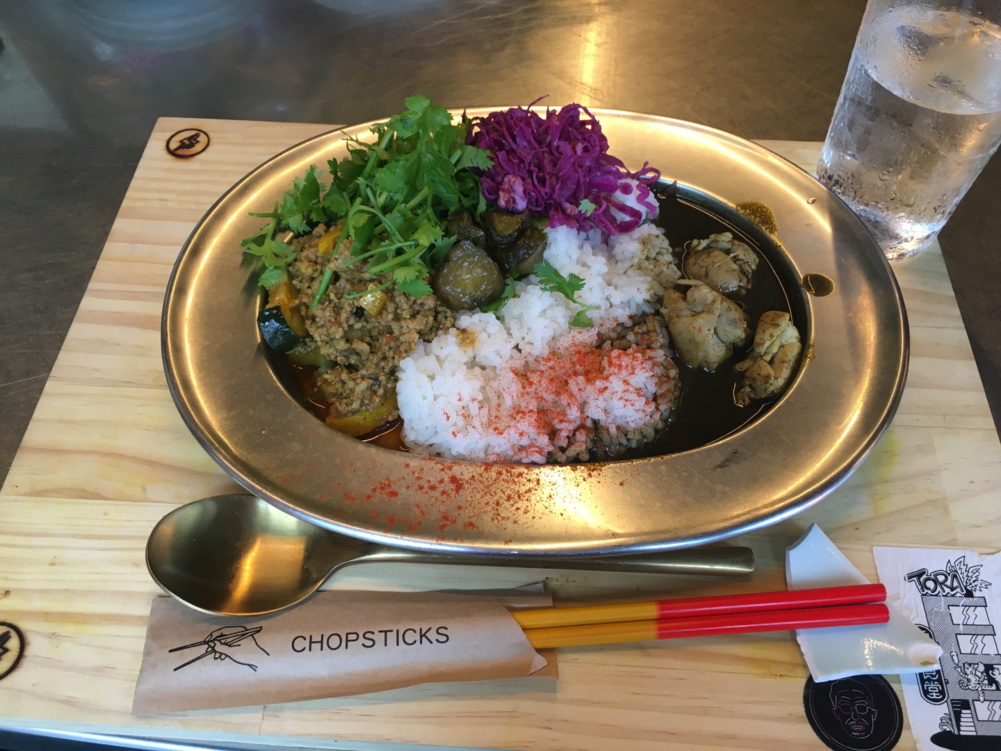 お昼はカレーorルーロー飯ランチがメインで、食後にチャイティーがついてきます!私が頼んだのはカシミールカレーとキーマカレーの「2つの愛盛り(1200円)」+パクチー増し増し(100円)