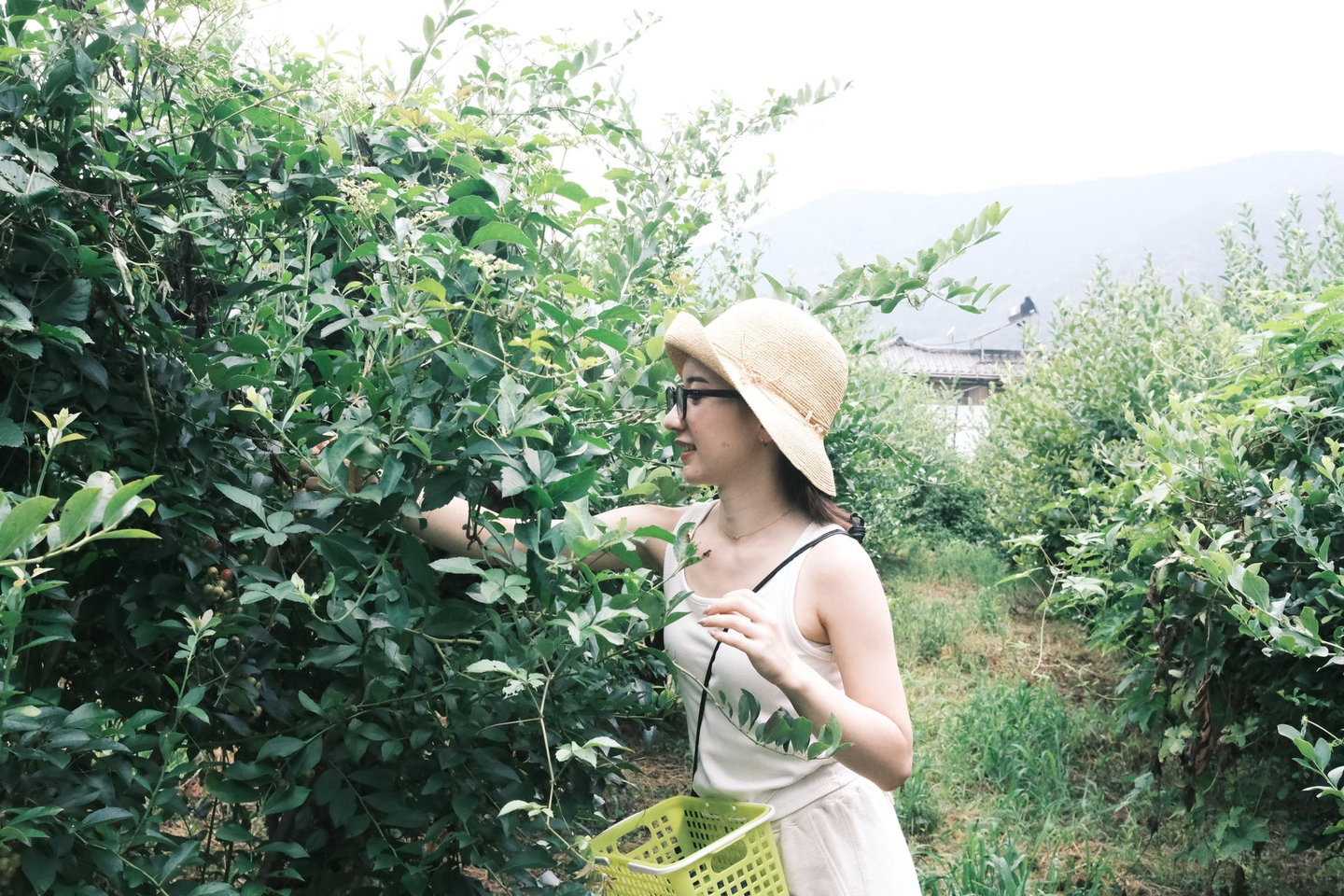 このブルーベリーが甘くてジューシー。採っているうちに、熟しきっていないものとしっかり熟しているものとを見分けられるように。収穫しながらつまんでもいいよと言われたものですから、甘そうなブルーベリーを見つけては、ついついカゴじゃなくて口に運んでしまいます。