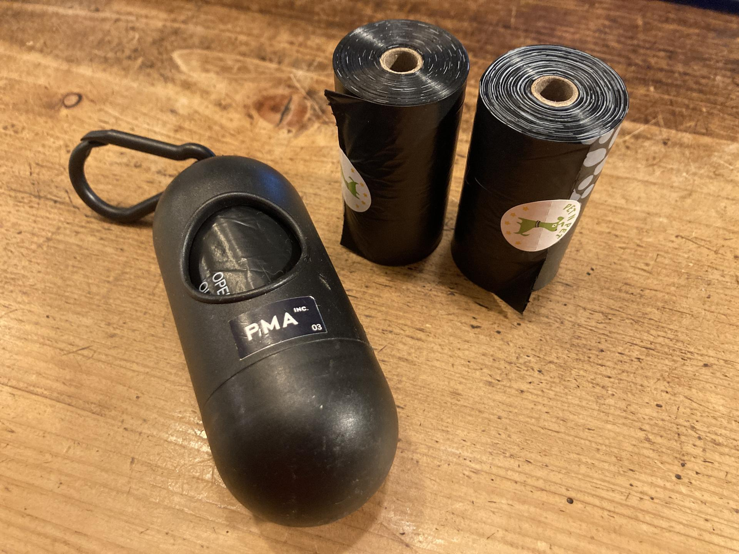 携帯しやすいように小さなゴミ袋をケースに入れて。拾ったゴミの重さも定期的に集計します。