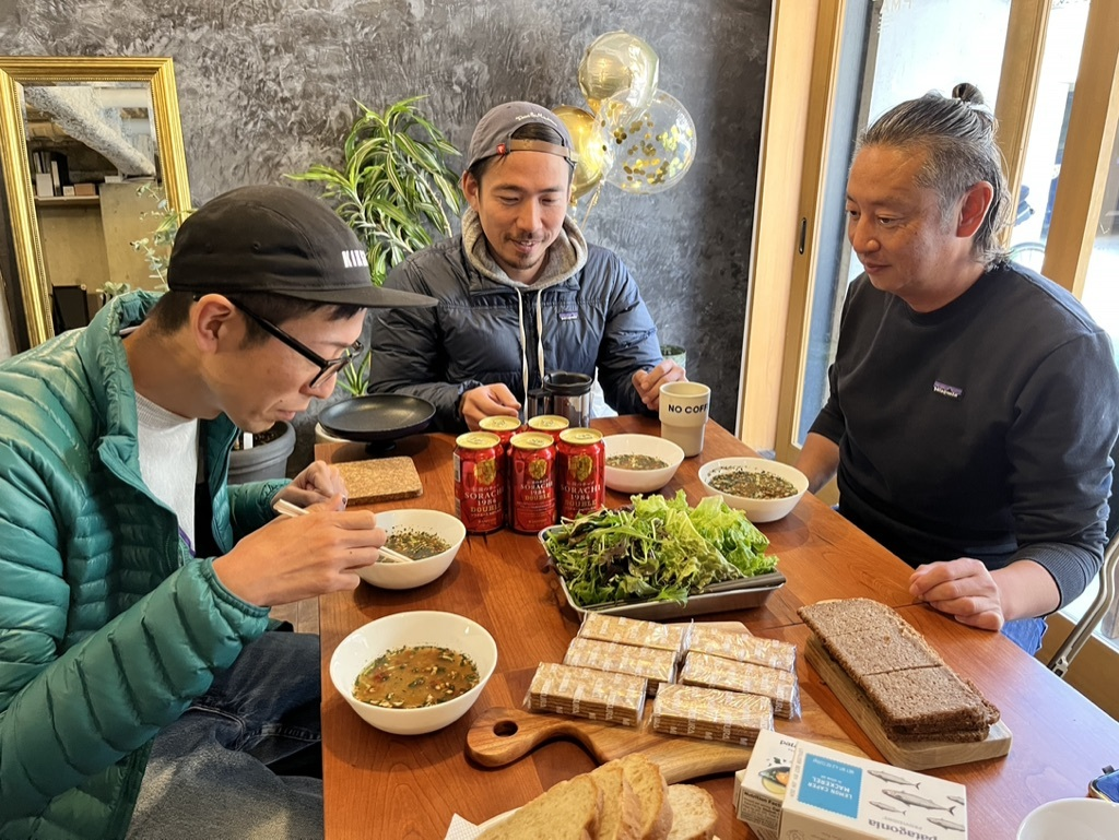 そんな「見聞き知る」を終えた後は、2022年を労うためにオフィスで納会を開催。クライアントであるサッポロビールさんのSORACHI1984や、パタゴニアプロビジョンズの日本酒、缶詰、スープをテーブルいっぱいに広げ、にぎやかな納会となりました。あ、もちろん仕事が残っている人は夜までお酒はお預けです。