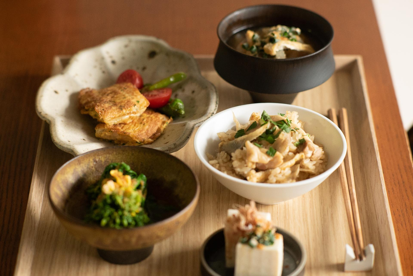 食卓に並ぶ美味しそうな料理の数々。炊き込みご飯、お味噌汁、冷奴におひたし、そして魚のピカタ。実は全てのお皿に、新商品が使われています。新商品くん、万能です。よりデイリーにTESIOを取り入れて欲しいから、いろんな料理に使える商品にしました。