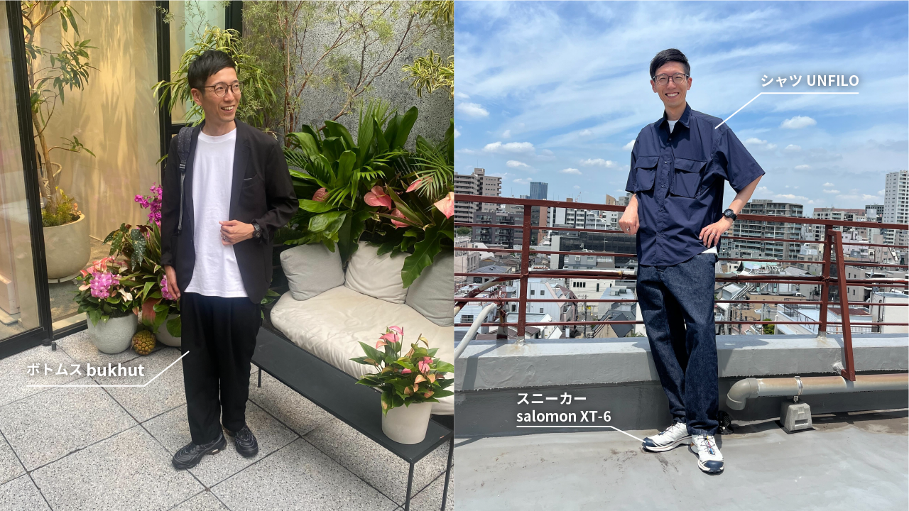 アパレルクライアントの撮影同行時(右)は、動き回ることが多いので動きやすさ重視。UNFILOのシャツはサラッと快適に。1番のお気に入りはsalomon XT-6のスニーカーで、疲れず着脱も簡単で重宝しているとのこと。ファッション系クライアントの撮影は、トレンド感も重視したコーディネートを意識しているみたいです。