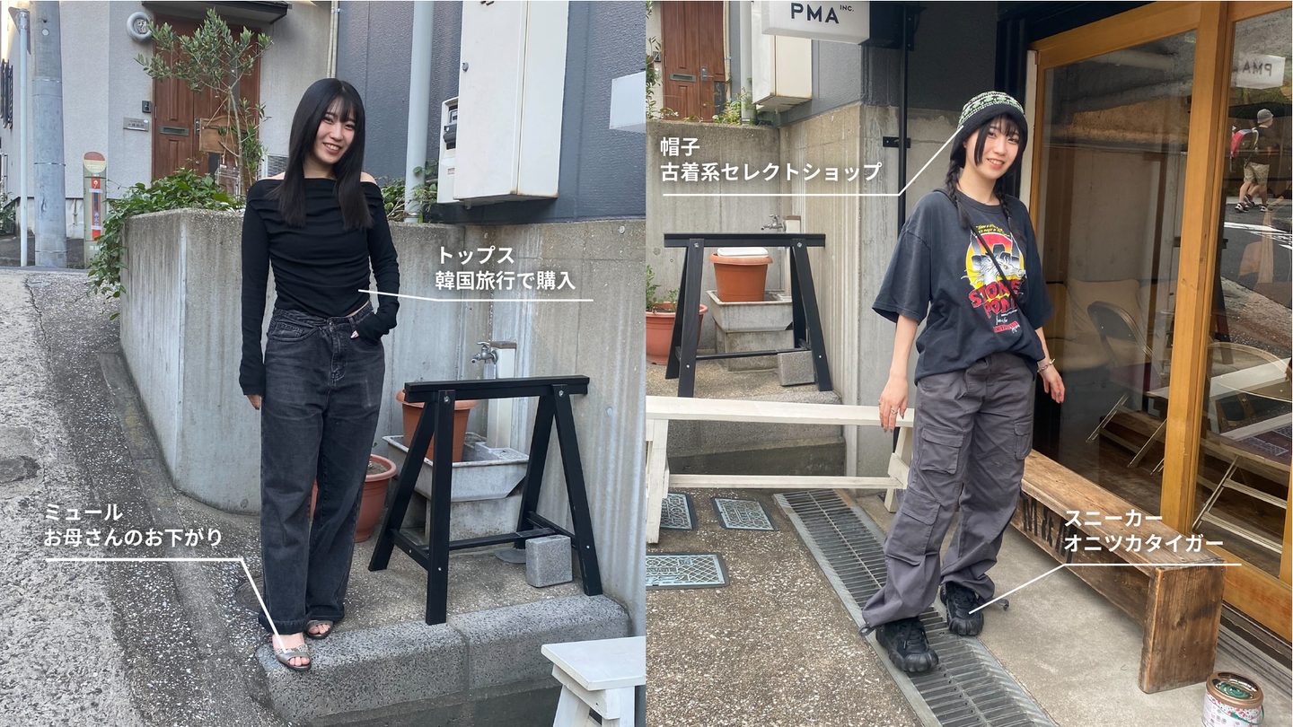 また別の日(右)は、古着屋で揃えたお気に入りコーディネート。特にスニーカーは、大学の卒業祝いで自分にプレゼントしたアイテムだそう。帽子もお気に入りで、夏でも蒸れないサマーニットのような生地の優れ物。