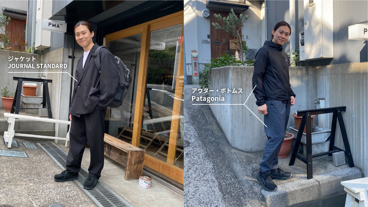 また別の日(右)は、マルちゃんが1年目からずっとお付き合いのあるクライアント、パタゴニアさんのアイテムを使った着こなしをご紹介。こんなふうに、すぐにでも走りに行ける身軽な格好の日も。アウターを脱ぎ着することで、室内の空調にも対応しやすく快適に仕事ができるのが良いのだそう。