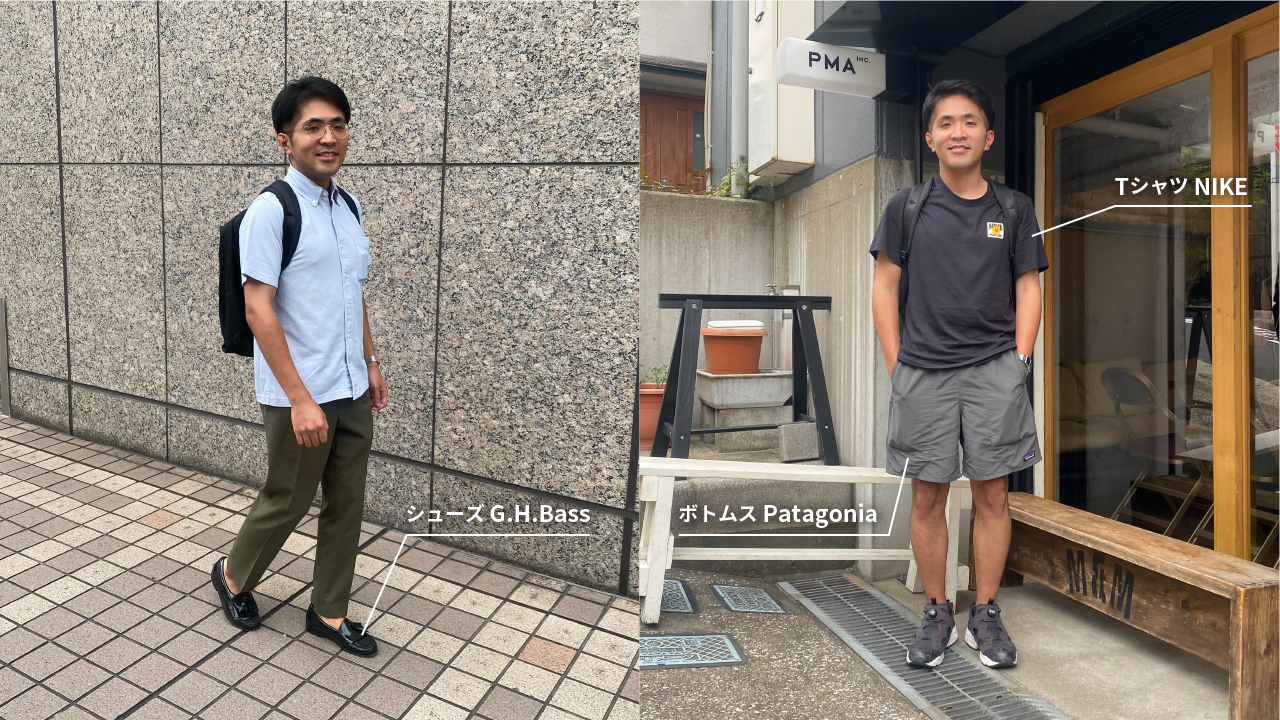 クライアント先への訪問がある日(左)は、暑くてもかっちり綺麗めがテーマ。コーディネートのポイントはG.H.Bassのローファーで、タッセルが付いて素敵なのに訳あり品で約8,000円で手に入れられた思い出の靴で、6年ほど愛用中とのこと。