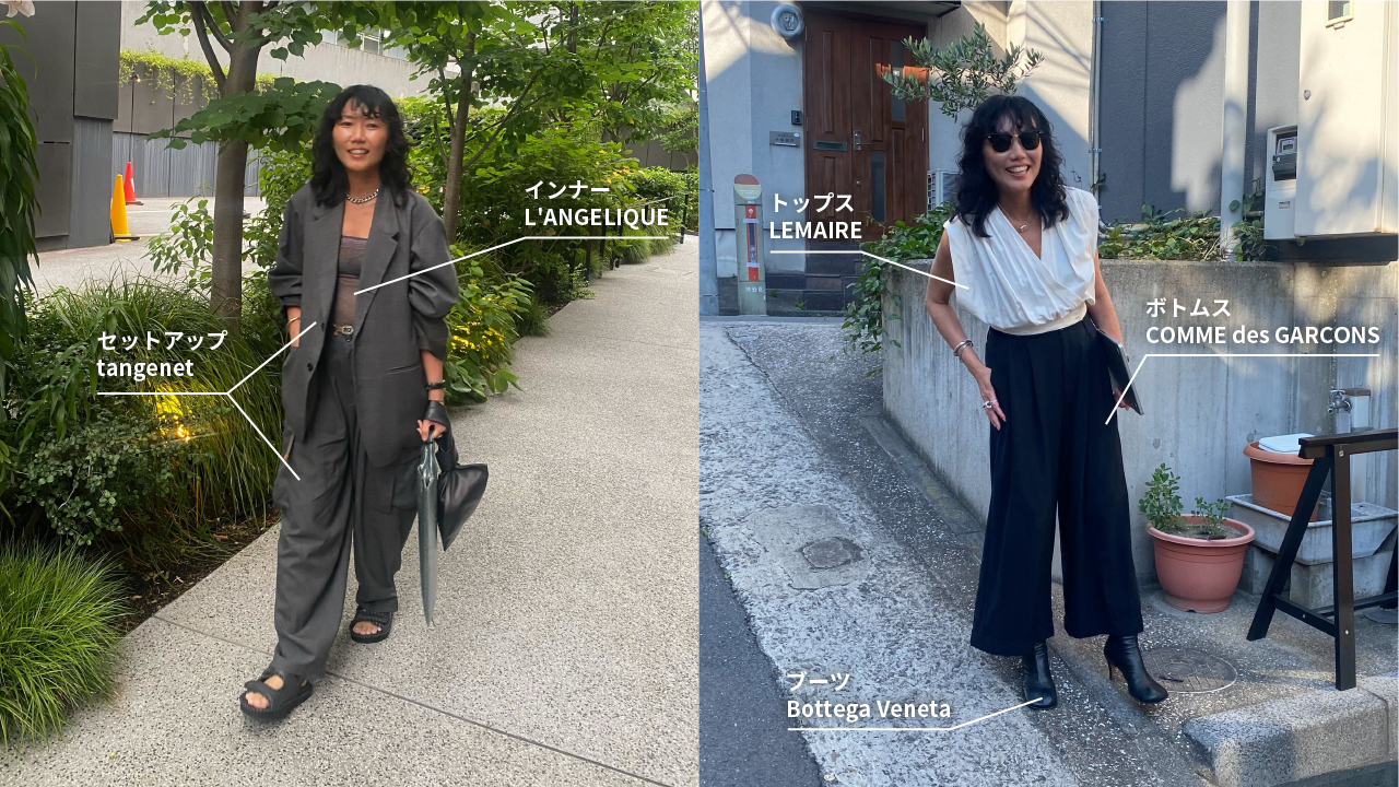 クライアント先への訪問時(左)は、旦那さんのブランド”tangenet”のセットアップ。特にカーゴパンツがお気に入りで、地元のバス停で見知らぬご婦人にも褒められたそう。メンズライクなセットアップだからこそ、インナーはレースで透け感のあるインナーを取り入れているのも素敵。