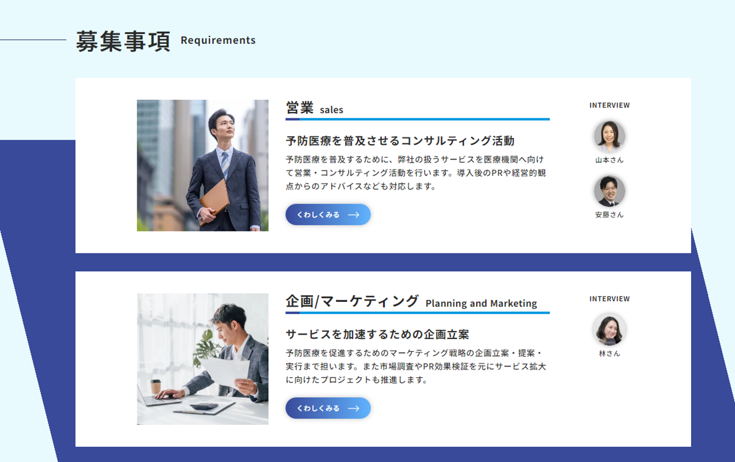 募集職種ごとに、社内に在籍しているメンバーの紹介記事を掲載しています。実際に働いている社員の声をすぐに見にいけるように、レイアウトを工夫しました。