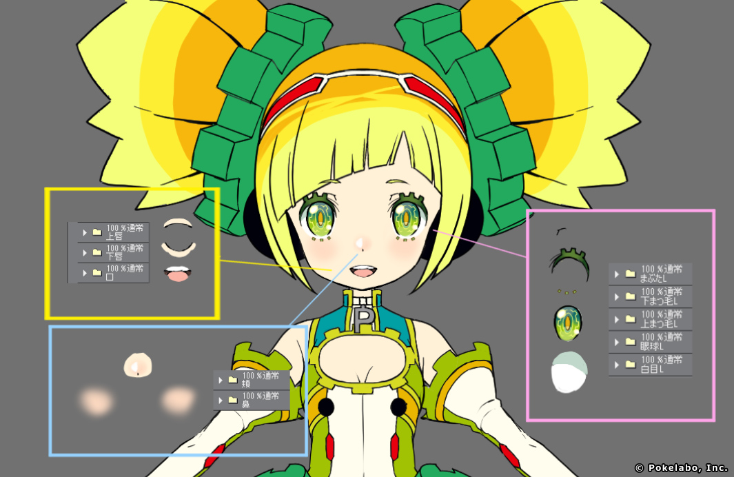Spineでは1つのパーツで済むところが目だけで5個パーツ分けしており、