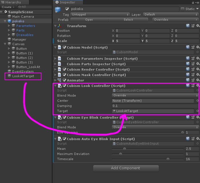 次にLive2Dキャラクターの瞳部分にCubism Look ParameterをAddComponentします。