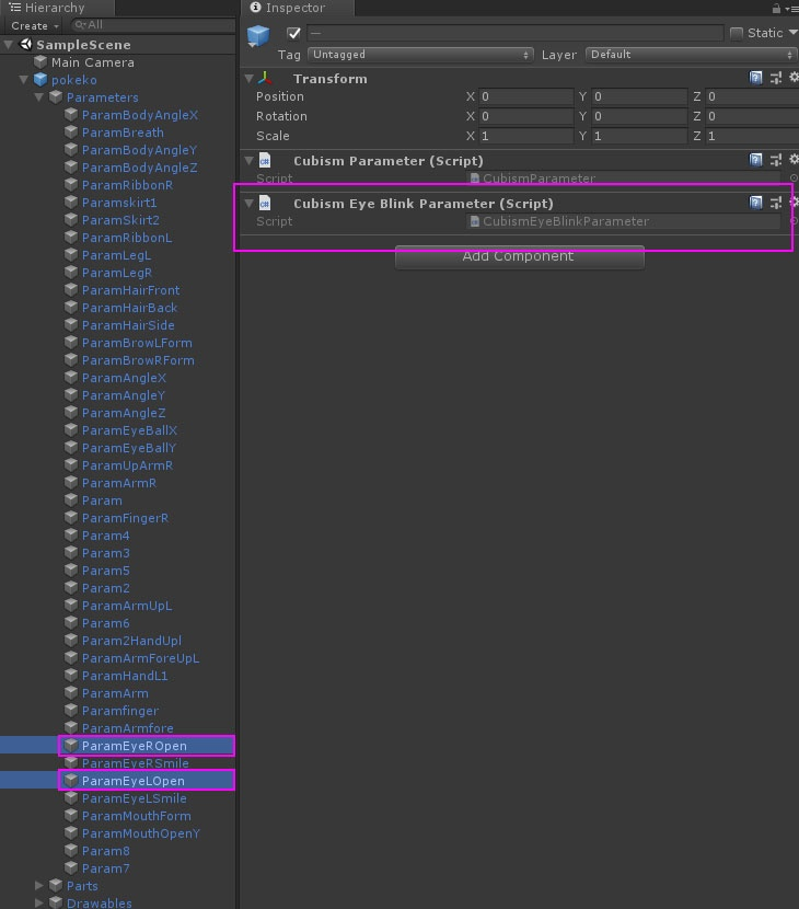 次に該当のパラメータにCubism Eye Blink ParameterをAddComponentします。