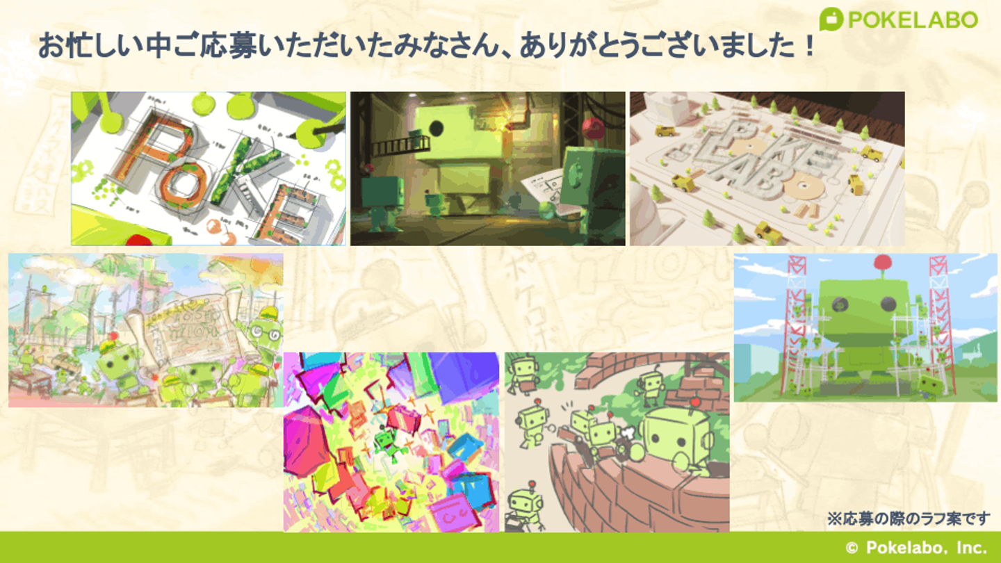 - 必須のビジュアルとして、会社のマスコットキャラクターであるポケロボくんをいれること
