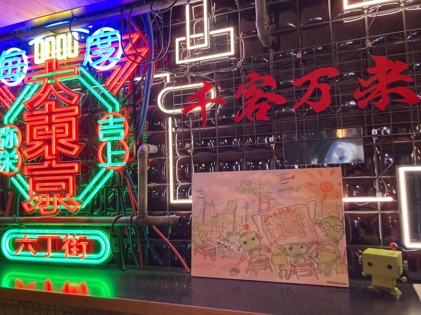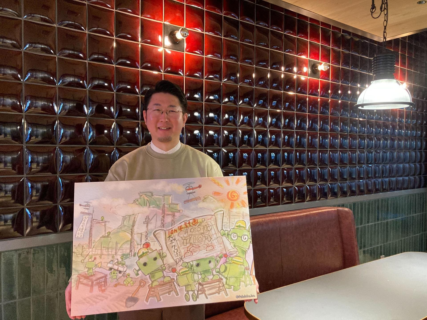 椛沢さんのコメント:今回の年末パーティのテーマが「建設」で、10カ年計画1年目というイメージ要件を受けて、安易とは思いつつも「10カ年計画を設計図に、ワイワイ社員一丸となって、ドキドキ・ワクワクてんこ盛りの超巨大ポケロボ君を作り上げている1年目」というシーンがパッと浮かんだので直感で筆をバババーっと走らせました!会社のイベント盛り上げに貢献できる部分があれば、積極的に参加したいと常に思っているので、私の気楽でユルユルのラフ画を見た周囲の方の精神的・時間的な参加ハードルを下げられるといいなという思いが一番でした。グラフィックチームのメンバーには「皆も描いちゃいましょう!」と、割としつこくリマインドし続けちゃいましたが。参加してくれた皆さんありがとうございました!私の案が採択されて、やっぱり選考で選ばれるのって嬉しいなって久しぶりに感じました。高校受験、大学受験、就職活動、当時の選考される緊張とドキドキ感が思い起こされて、精神の活性化にもなってよかったです!貴重な機会をご用意いただきありがとうございました!