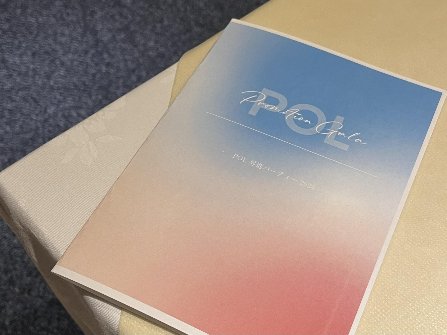 ▲皆様のお手元にある赤と青のグラデーション表紙の冊子は、乗船の際にお渡しした【昇進パーティーのしおり】です!